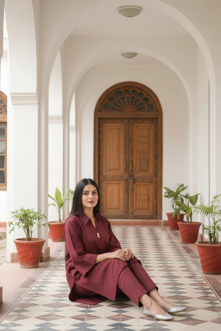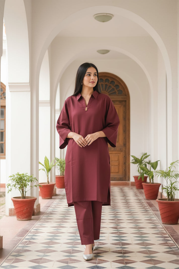 Top: Straight long kurta with a soft collar and V-slit neckline