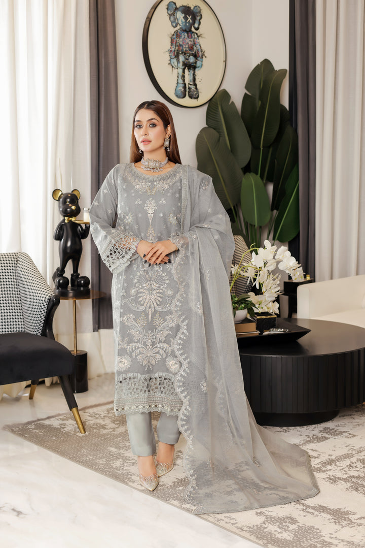 - Semi-stitched 3-piece luxury embroidered Aiyudiya Net & organza outfit