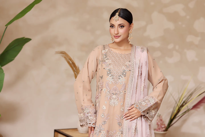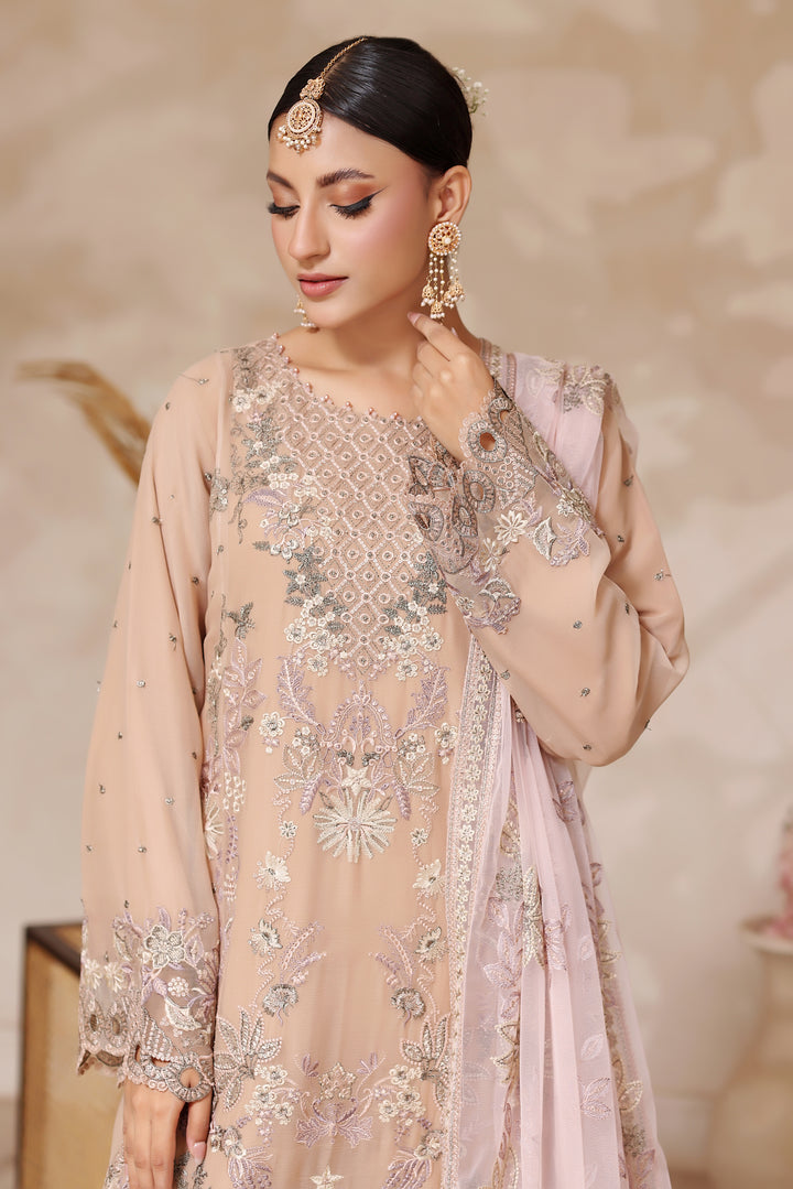 This Semi-Stitched three-piece set features a luxury embroidered Chickenkari chiffon shirt with intricate boring work, paired with a delicately embroidered chiffon dupatta and a dyed jacquard viscose trouser for a refined finish. Designed to celebrate feminine charm, FIZA brings comfort, creativity, and class together - allowing you to tailor your perfect fit while exuding effortless allure.
