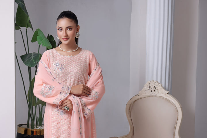 Each 3-piece set includes a semi-stitched luxury embroidered chiffon shirt with attached boring and sequence work, a luxury embroidered chiffon dupatta that drapes effortlessly, and a jacquard viscose trouser designed for a smooth and polished finish.