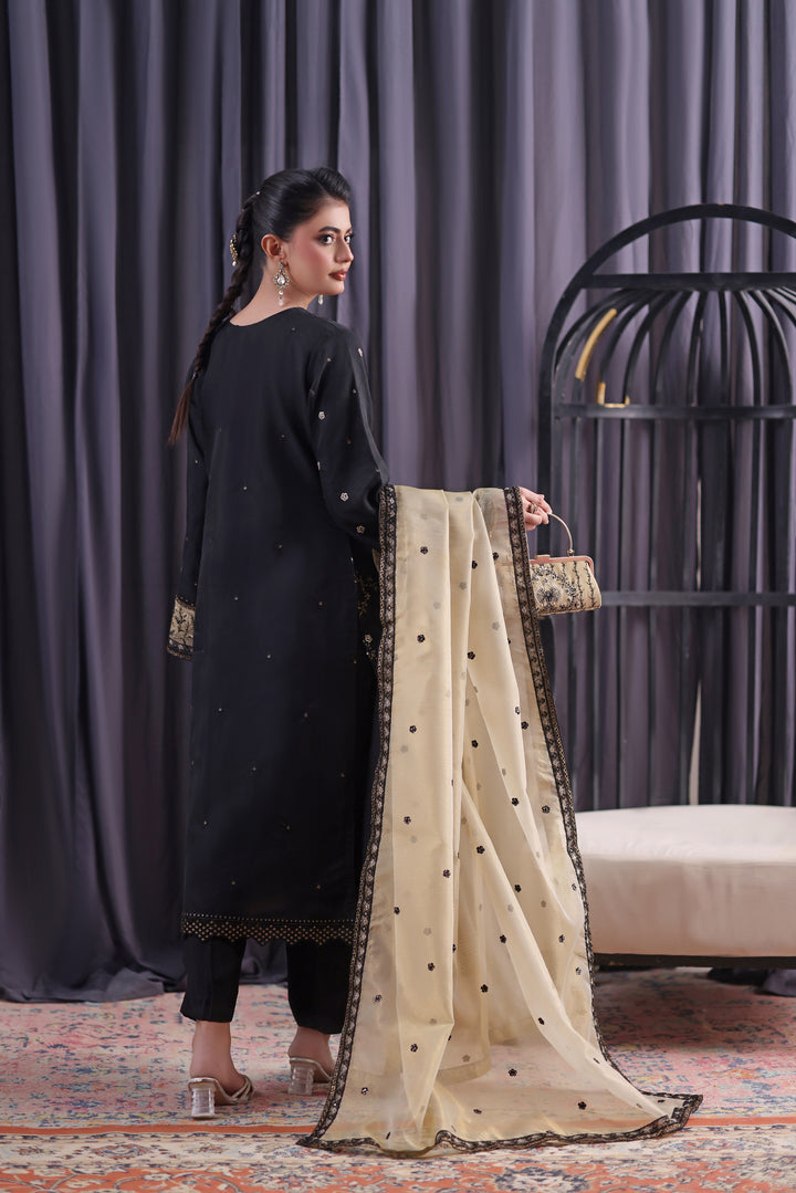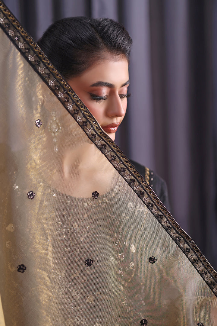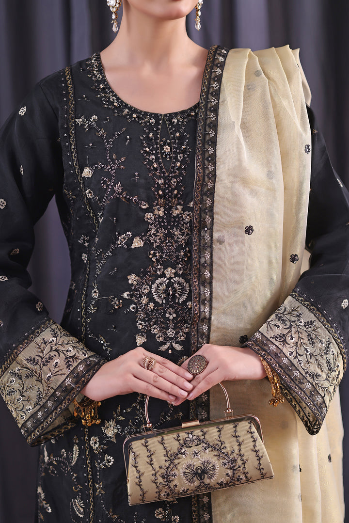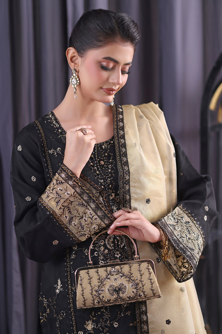 Each 3-piece set includes a semi-stitched premium organza-lined shirt, a luxury khaddi net dupatta, and a raw silk trouser for a smooth, graceful finish. To complete the experience, every outfit is paired with an exclusive complimentary designer clutch, adding a final touch of sophistication to your festive look.