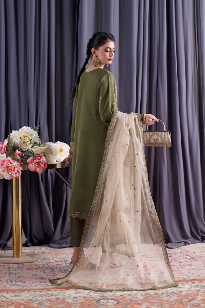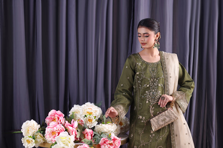 Each 3-piece set includes a semi-stitched premium organza-lined shirt, a luxury khaddi net dupatta, and a raw silk trouser for a smooth, graceful finish. To complete the experience, every outfit is paired with an exclusive complimentary designer clutch, adding a final touch of sophistication to your festive look.