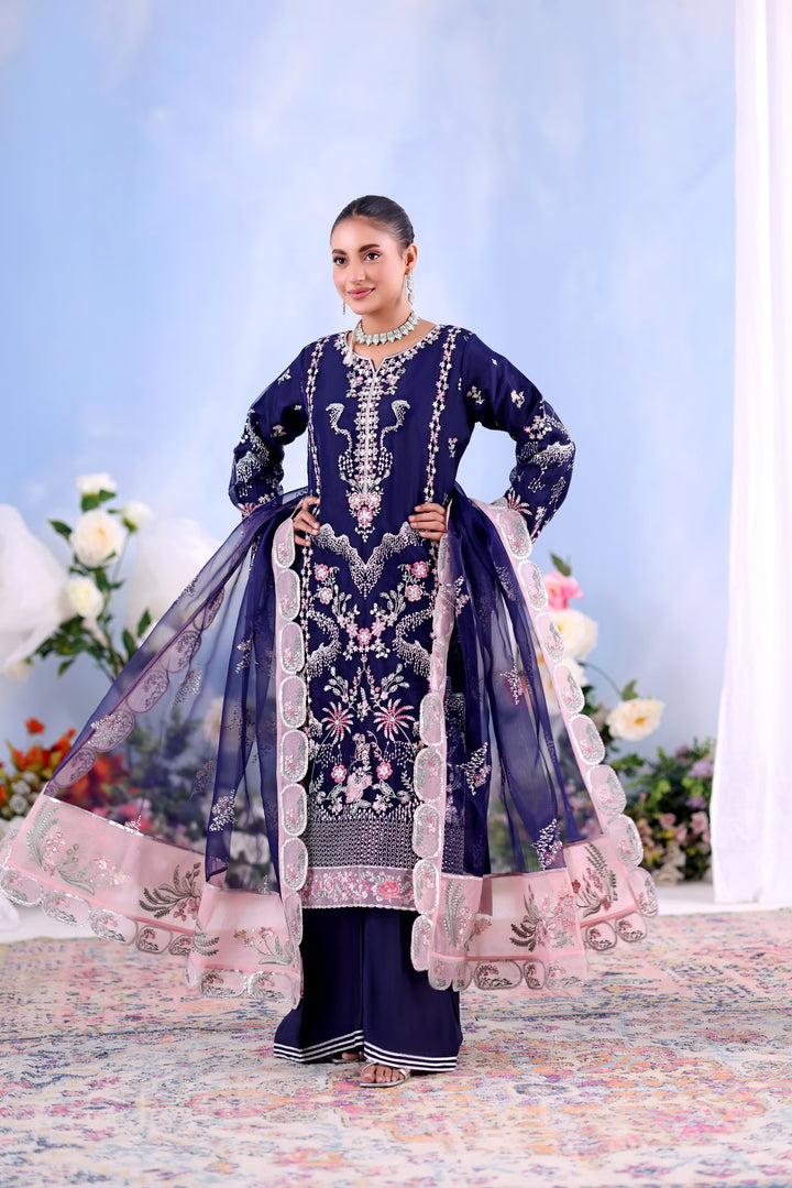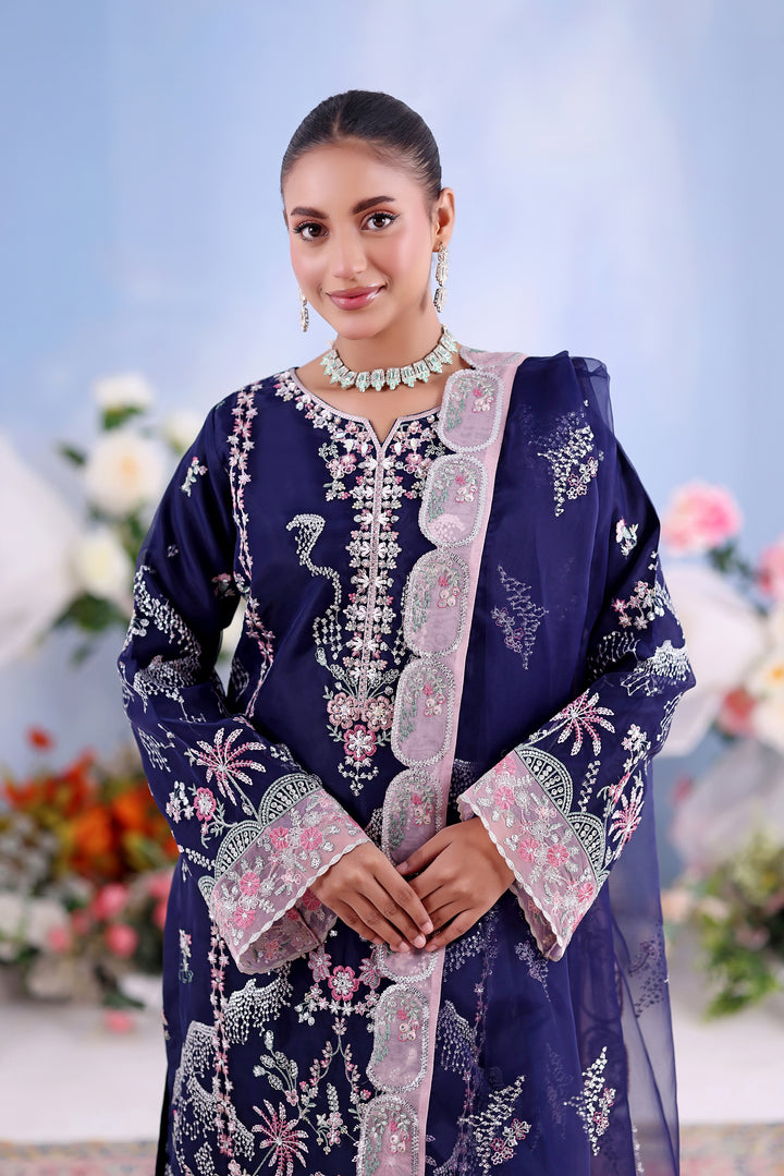 - Unstitched 3-piece luxury embroidered organza outfit