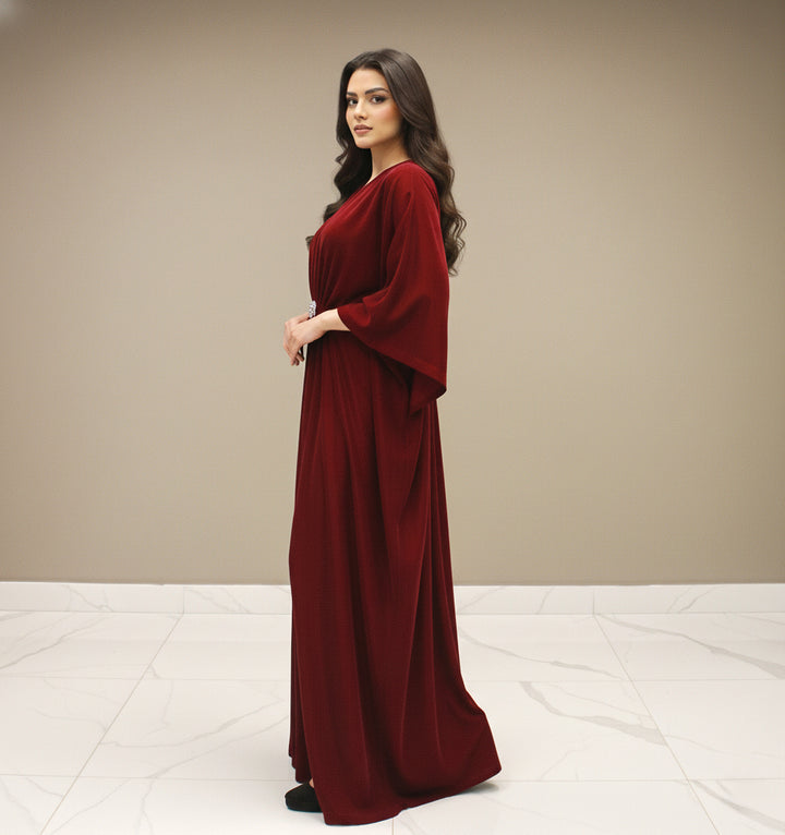 Blending regal charm with winter warmth, VELORIA embodies the essence of timeless sophistication. Each kaftan crafted from premium imported velvet - flows with graceful ease, offering an elegant silhouette that combines modern refinement with traditional modesty. The smooth velvet texture, radiant sheen, and crystal-embellished brooches bring understated glamour to every movement.