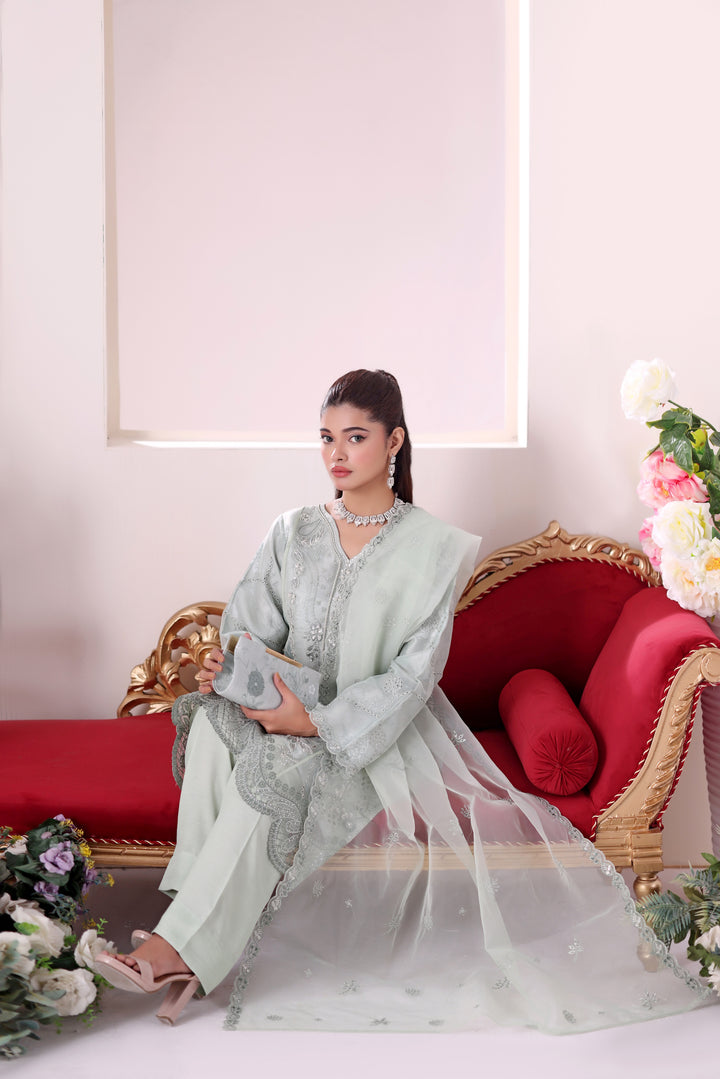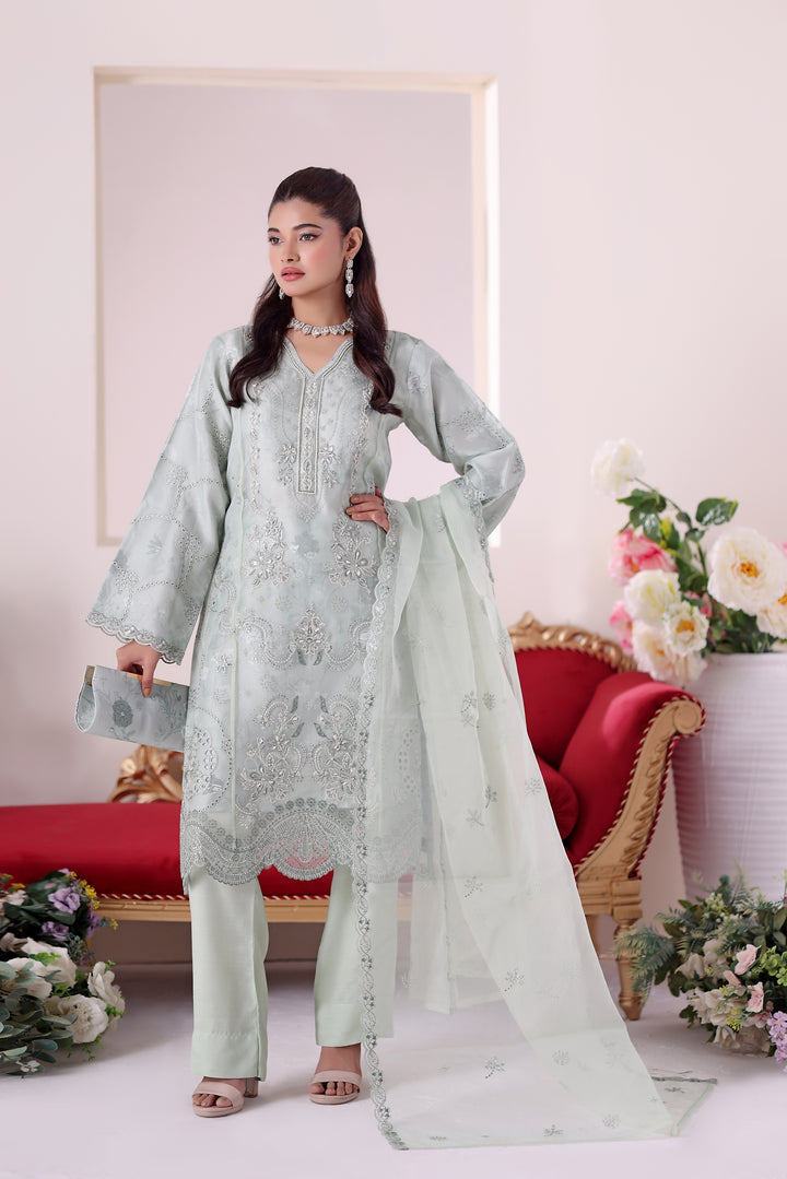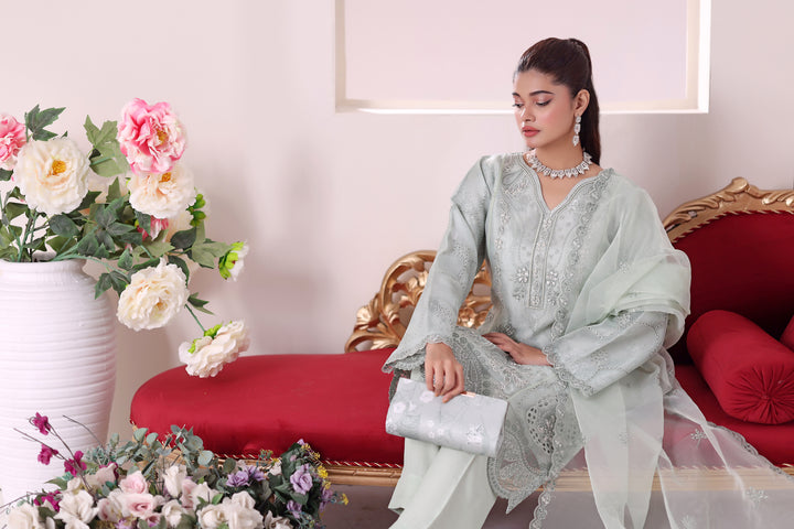 Each 3-piece set includes a semi-stitched heavy embroidered organza shirt adorned with embellishments and paired with a digital printed silk inner, a luxury embroidered fancy organza dupatta, and an unstitched raw silk trouser for a smooth, elegant finish.