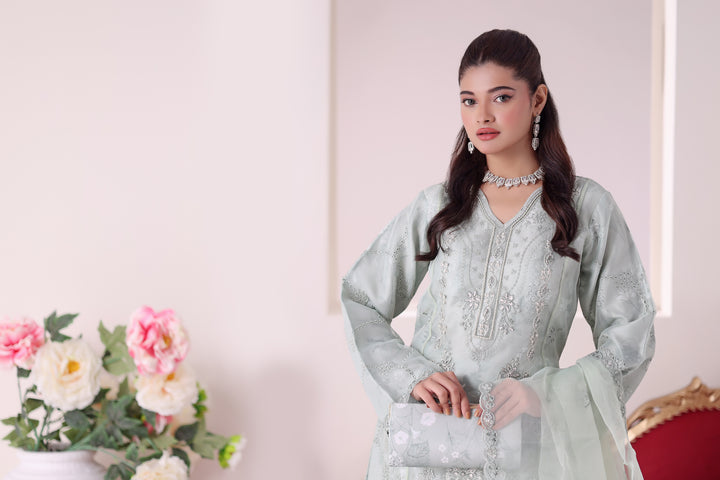- Semi-stitched 3-piece luxury embroidered organza outfit