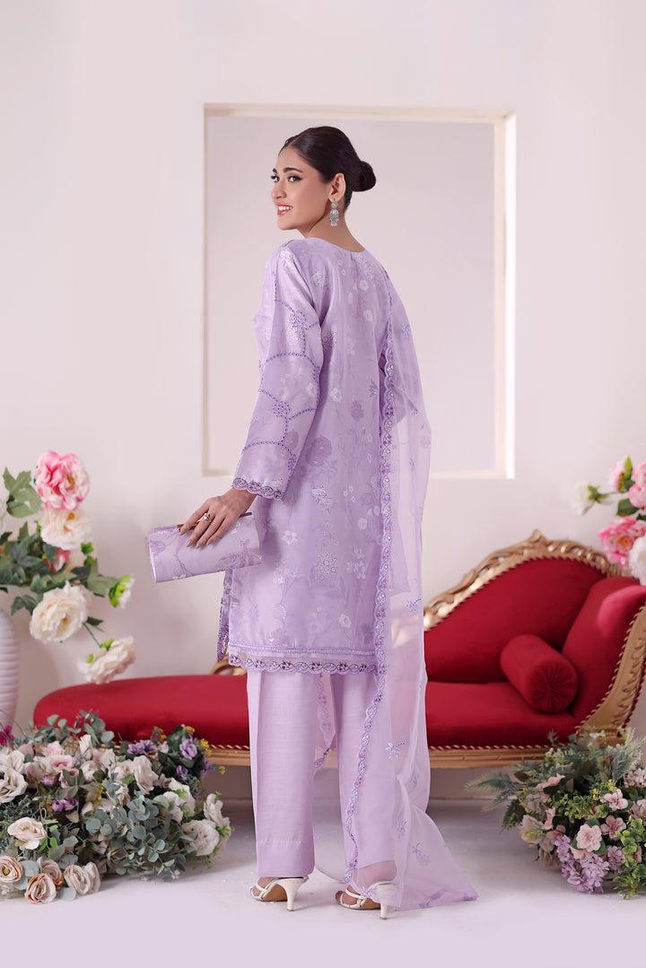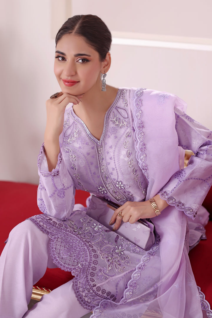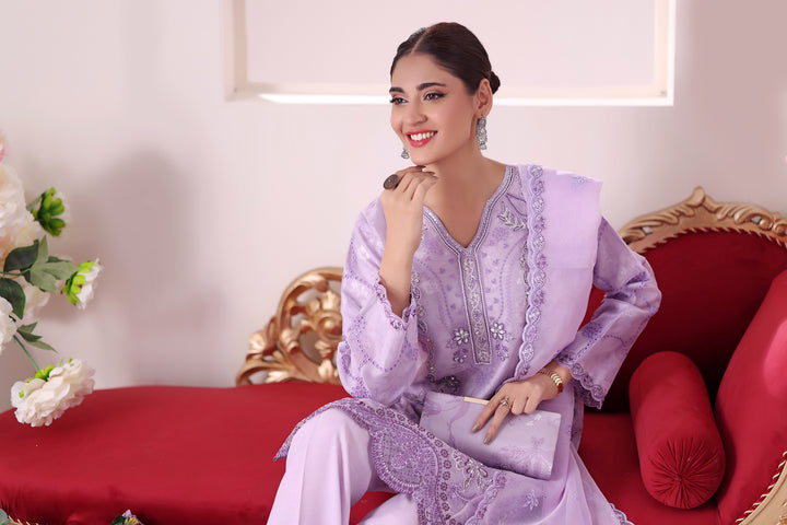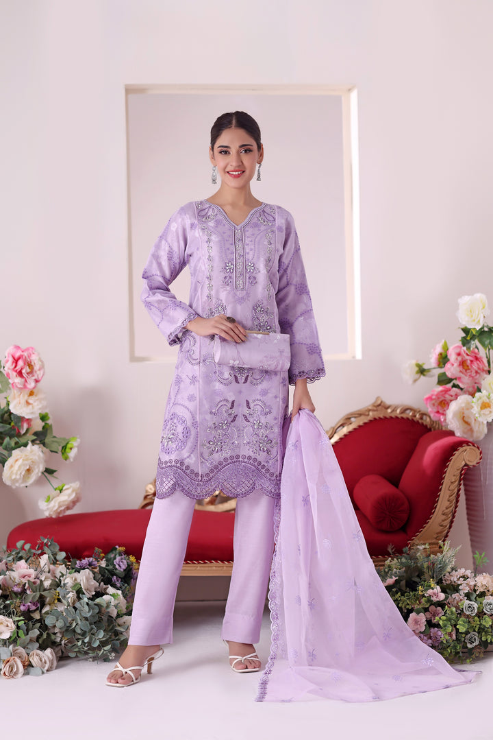 Each 3-piece set includes a semi-stitched heavy embroidered organza shirt adorned with embellishments and paired with a digital printed silk inner, a luxury embroidered fancy organza dupatta, and an unstitched raw silk trouser for a smooth, elegant finish.